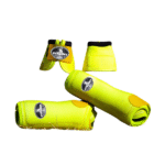 o conjunto oferece splint, que possui a função de proteção para os membros do animal, feito de neoprene com almofadas internas que absorvem o impacto e evitam atritos, e o cloche, que tem ajuste anatômico e revestimento externo em nylon e forro em neoprene, garantindo conforto sem comprometer a mobilidade