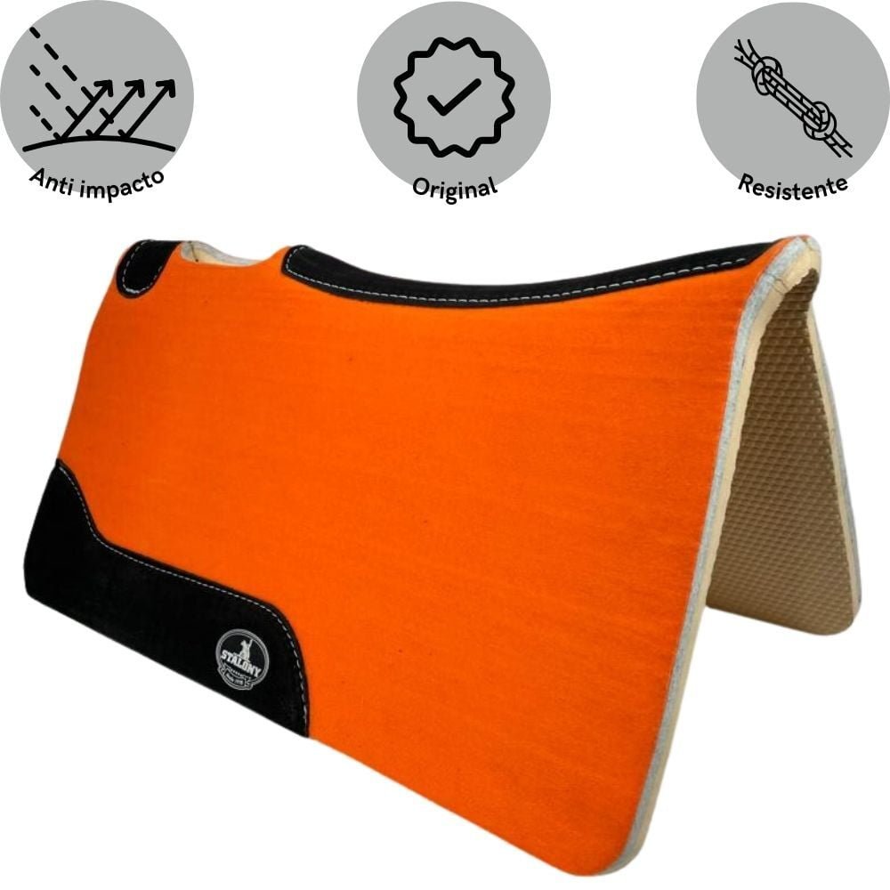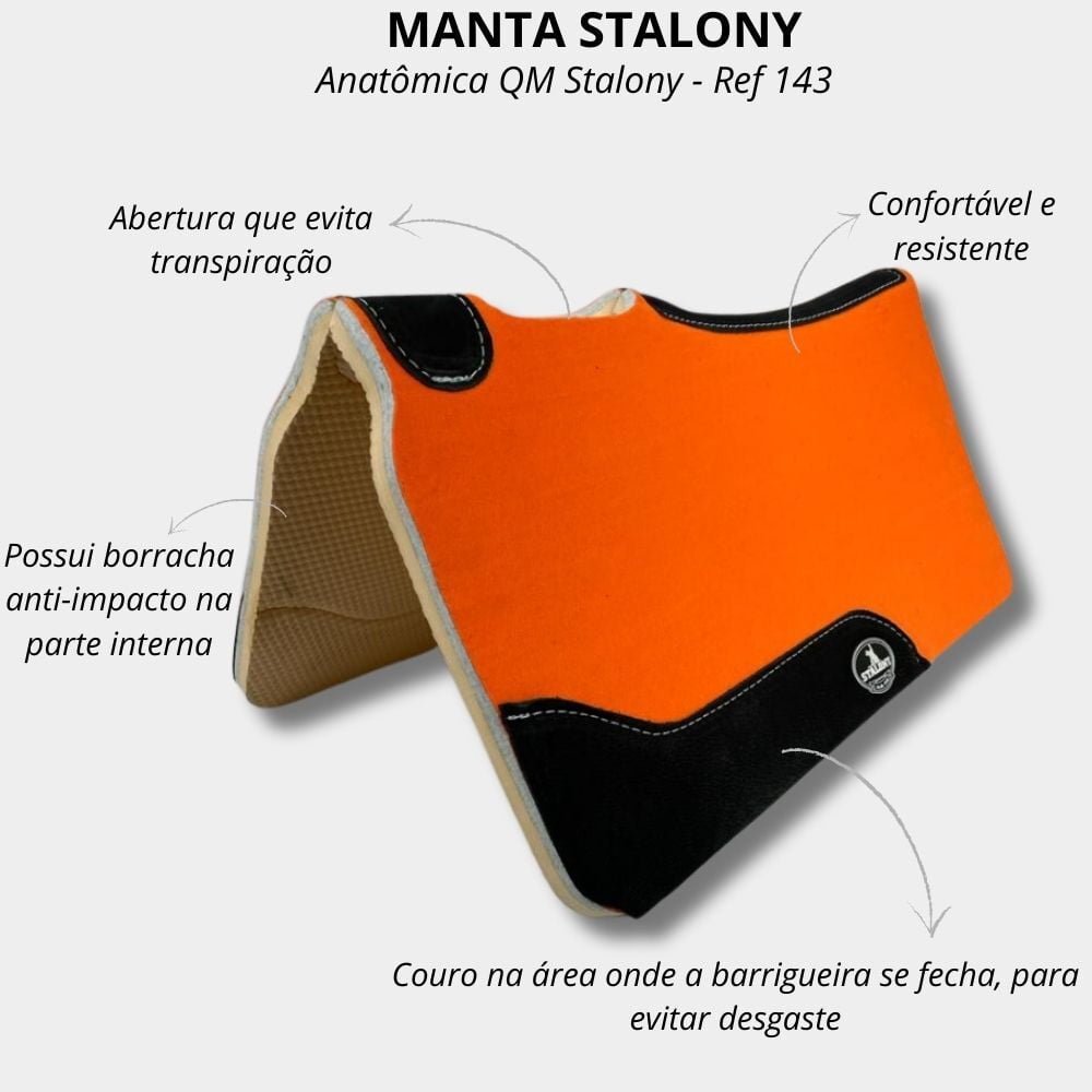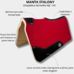 A manta ortopédica Stalony é desenvolvida com borracha de impacto de alta densidade moldada para se ajustar à anatomia do dorso do animal. seu design proporciona melhor encaixe de sela, ideal para cavalos sensíveis ou com predisposição a lesões